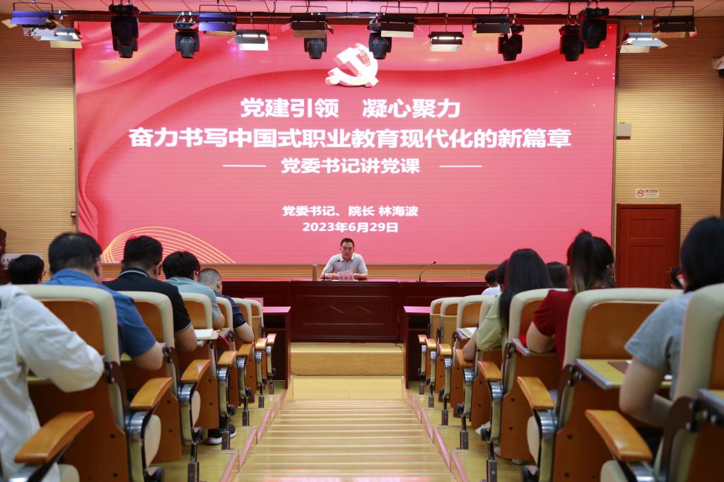党委书记林海波以“党建引领 凝心聚力,奋力书写中国式职业教育现代化的新篇章”为主题为全体党员讲授了一堂生动深刻的党课,他首先代表学院党委向奋斗在学院不同岗位上的全体共产党员致以节日的问候,向受表彰的支部和个人表示祝贺,向所有党员干部教职工为学院发展做出的努力和贡献表示忠心的感谢。党课内容主要围绕三方面展开:一是深刻领悟习近平新时代中国特色社会主义思想的重要意义;二是准确把握中国式现代化的本质要求;三是在中国式职业教育现代化新征程上建功立业。