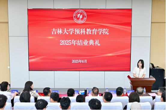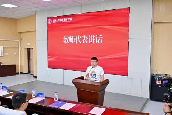 教师代表刘琦烽讲话。回望这一年,预科时光见证了每位同学的成长蜕变。预科阶段不仅为同学们打下了坚实的学业基础,更培养了一批具有主人翁意识的吉大学子。他深情寄语同学们:“希望同学们永葆这份求知热忱,将理想的势能转化为学习的动能,祝愿同学们历经沧桑,依旧怀揣梦想,无畏前行!”