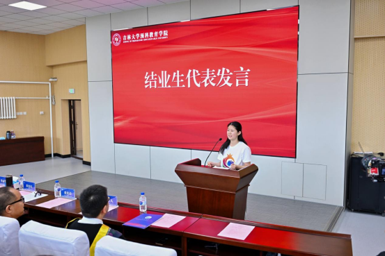 结业校友代表2020级预科生罗士城同学发言。他回忆了在预科阶段的求学时光,感谢预科老师们的谆谆教导和无私奉献,让每位同学都在专业素养、实践能力和思想成长等方面取得了显著进步。他鼓励同学们,在本科阶段要珍惜时光,深耕专业知识、投身社会实践,以黄大年教授为榜样,将个人理想融入国家发展的滚滚洪流。