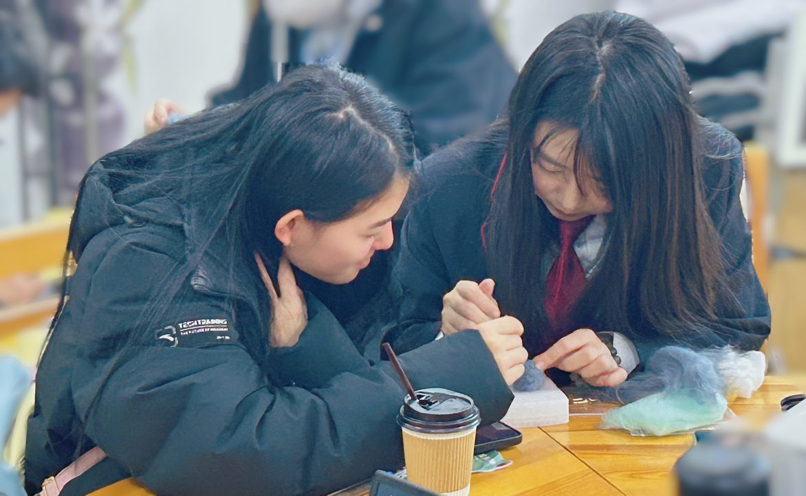 活动开始前,心理健康协会的志愿者们为同学们准备了暖心热饮以及减压音乐,为同学们营造了温暖舒适的活动氛围。心理健康教育中心张梦元老师准备了丰富的表情包,邀请同学们进行选择,表达自己最近的情绪。同学们通过表情包直观表达,互相分享心情,轻松自然,缩短了社交距离。活动过程中,在同学们通过教程视频了解了羊毛毡制作工具的使用方法,利用两根特质钢针、一块泡沫板、数团彩色羊毛,尝试动手练习。同学们仔细观看教程步骤并逐渐掌握羊毛毡手工制作技巧,热火朝天地戳了起来。在遇到困难时同学们除了召唤老师和志愿者,还借助群体力量,互帮互助。钢针上下戳动,作品逐渐成形,现场充满了欢声笑语,活动气氛十分欢快。