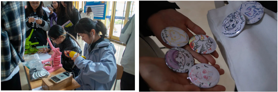 活动伊始,教一楼大厅便被浓厚的主题氛围包裹。“人人享有心理健康服务”主题条幅早已摆放就位,过往同学纷纷驻足,在志愿者的引导下,郑重地签下自己的名字,以这种方式表达对心理健康服务普及的支持与期待。社团精心打造的活动照片墙展示了心理健康协会以往举办的各类特色活动,一张张生动的照片直观地呈现了社团的活动特色与魅力,让同学们清晰地了解到加入社团后能参与的丰富活动,不少同学在照片墙前驻足讨论,对社团活动表现出浓厚兴趣。创意徽章DIY 环节更是将现场气氛推向高潮。社团为同学们准备了丰富的材料,包括各色徽章底托、颜料、贴纸等,同学们可以充分发挥自己的想象力和创造力,设计并制作属于自己的主题徽章。有的同学绘制了可爱的卡通,有的同学写下了鼓励的话语,还有的同学用图案展现了自己的心情。大家纷纷表示,把喜欢的图案“戴”在身上,让这枚小小的徽章成为了流动的温暖符号,不仅极具纪念意义,还能时刻提醒自己关注心理健康。