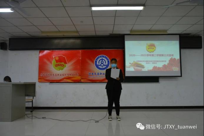 为喜迎伟大的中国共产党百年华诞,传承和弘扬党的光荣传统和优良作风,进一步激发全院广大青年团员爱党爱国热情。我院于2021年5月7日在教一楼122教室开展以《喜迎建党100周年华诞》为主题的团课活动。据我院疫情防控相关要求,团课分两场开展。团课主持人由青年志愿者协会的熊祎冉同学担任。