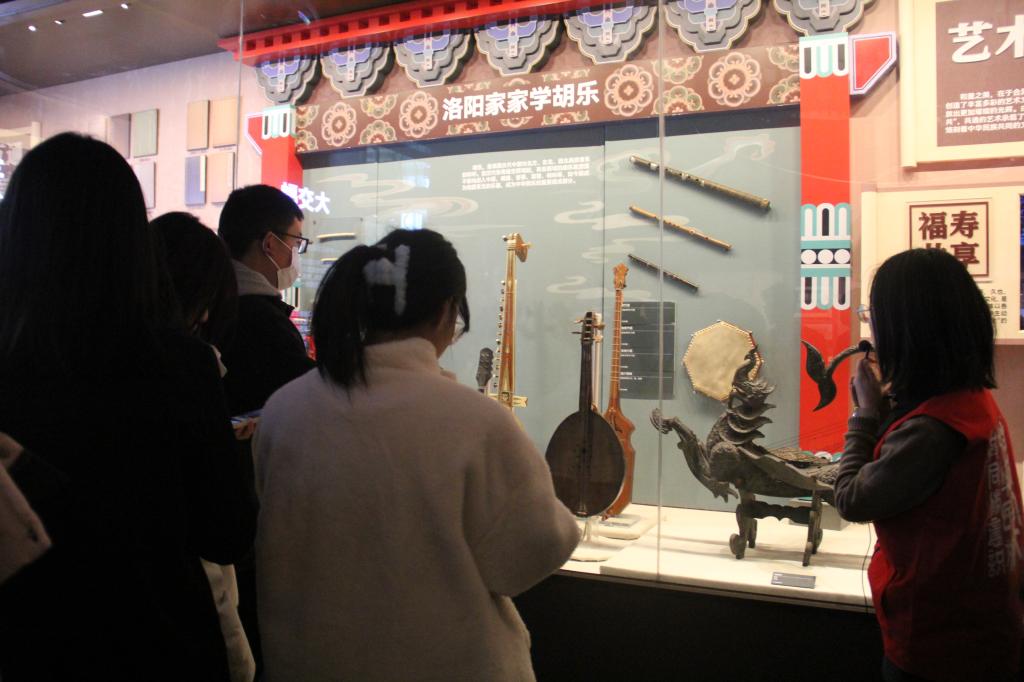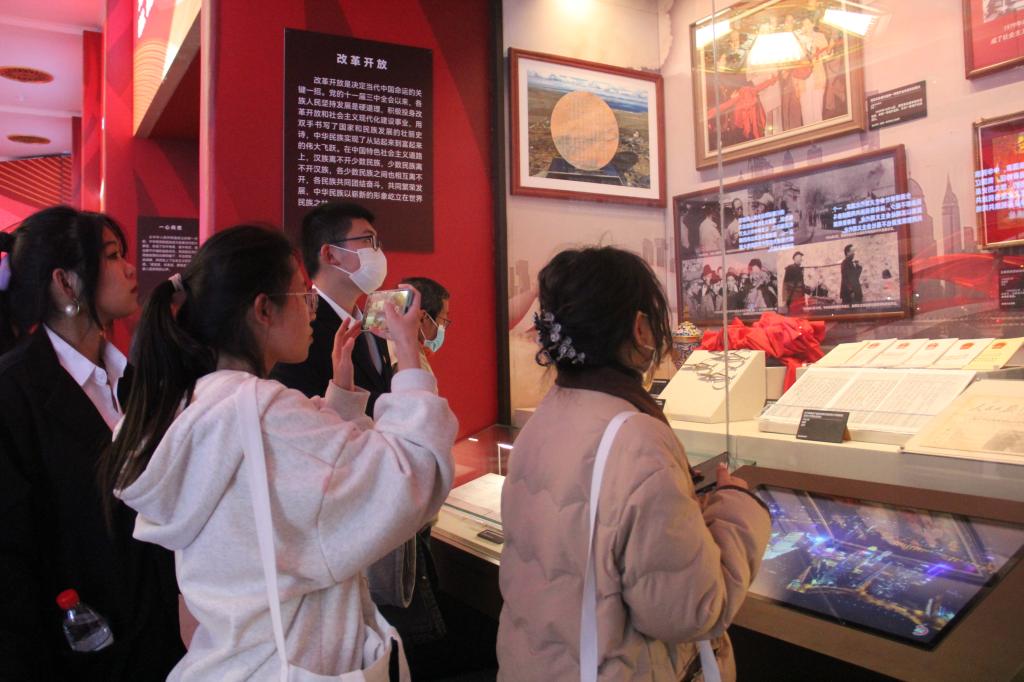 漫步在展厅内,在工作人员的精彩讲解下,大家如同遨游在几千年来古朴厚重的中华文明历史长河之中。琳琅满目又极具民族特色的古籍、服饰、乐器等文物在橱窗内悄声向人们诉说着中华民族交往、交流、交融的历史故事。在展览中,大家深入探寻民族团结的文化根脉,被各种文物古籍深深吸引,不时驻足观看,仔细阅读相关介绍。同学们通过近距离观摩珍贵的历史资料,认真聆听古籍文物、民族服饰、民族特色展品背后的故事,用心体会中华民族在漫长历史进程中,各民族共同创造发展的斑斓文化,感受到“四个与共”的中华民族共同体理念,也感受到波澜壮阔的中华民族发展历史,更是深刻感悟到中国共产党百年民族工作的伟大成就。