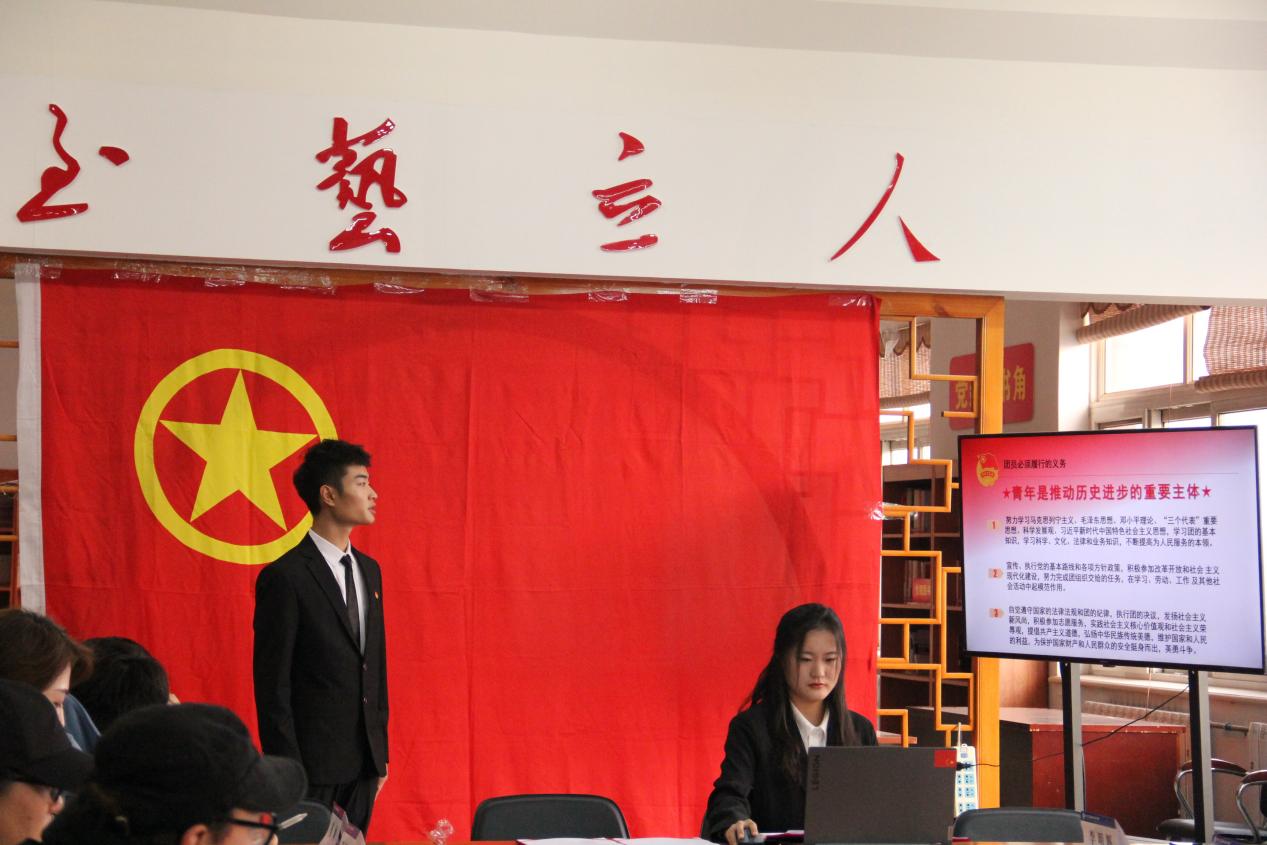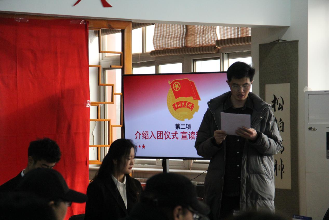 轨道交通系梁天勇同学作为入团介绍人代表,宣读团章中有关团员的义务和权力的条款。各位团员要以入团作为新的起点,坚定理想信念,牢记入团誓词,以团章为准则来规范自己的言行,做合格的优秀的共青团员。