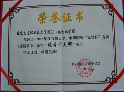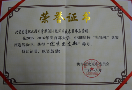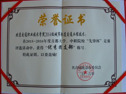 为深入学习贯彻党的十八届三中全会精神,坚持党建带团建,深入开展“创先争优”活动,推动首都大学、中职院校共青团系统工作,在首都高校青年团员中选树典型、表彰先进、推广经验,在2015-2016年度首都大学、中职院校“先锋杯”的评比表彰中,我院14级城市轨道交通工程技术团支部、14级物业管理团支部、14级汽车技术服务与营销团支部被授予“2015——2016年度首都大学、中职院校‘先锋杯’优秀团支部”荣誉称号。