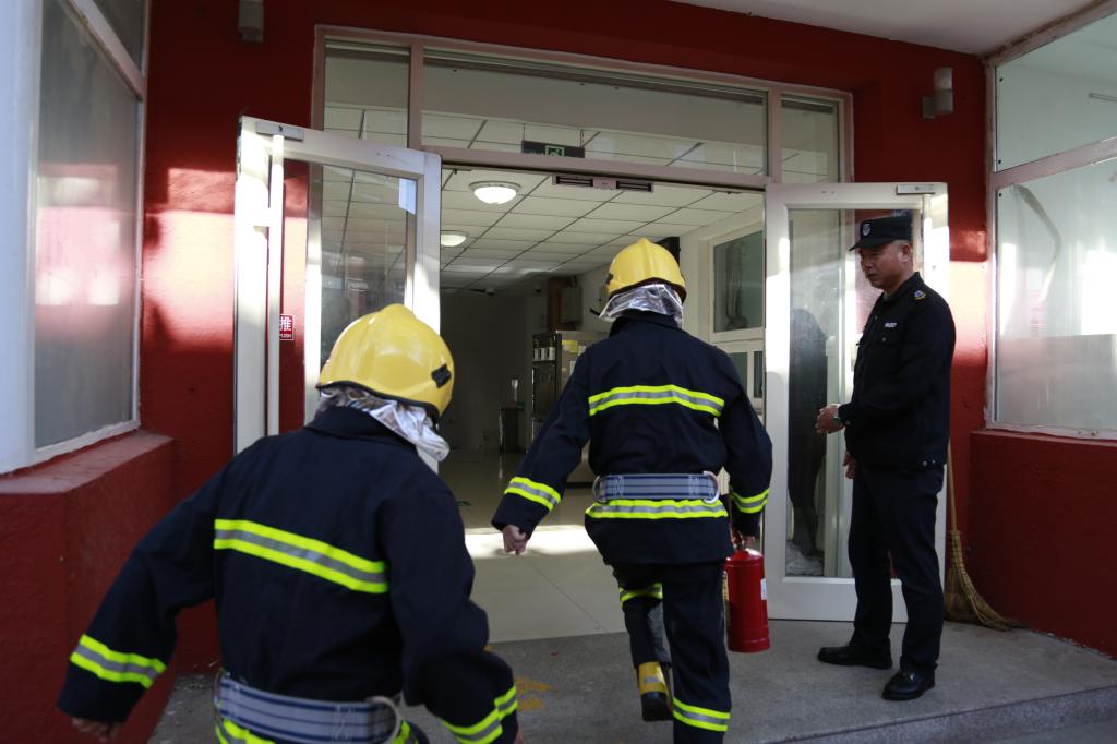演练现场,总指挥王颖副院长通过消防广播宣布疏散逃生演练正式开始。12:15,演练流程有序拉开:宿管员发现宿舍楼二层发生火情,中控室立即响应,并在总指挥指示下启动消防应急疏散预案;随后宿管员首先在宿舍楼内通过消防广播进行通知预警并迅速上楼进行排查,确认是二层楼道出现火情,即刻拿取就近的灭火器、消火栓进行灭火;疏散组的工作人员则有序组织学生按照逃生通道进行疏散;微站队员上楼进行滞留人员情况排查;警戒组做好楼门警戒;截至12:25,火情被完全控制;12:30,全部学生疏散到室外安全空旷地带,警情完全解除;医疗救护组、影像采集组密切配合,一切工作有条不紊的进行,演练顺利结束。