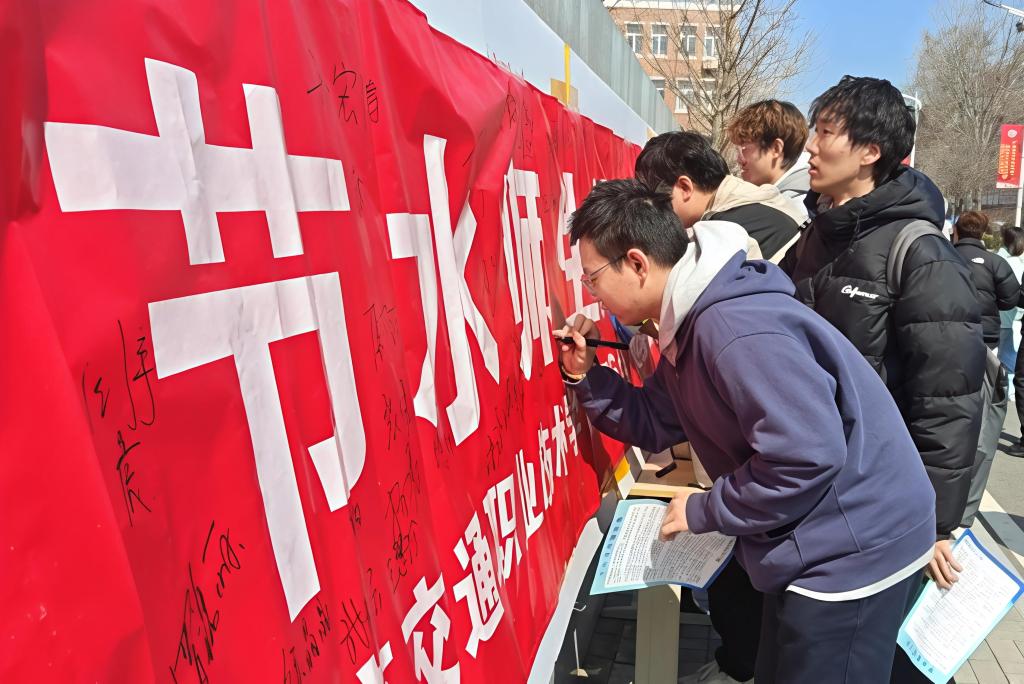 活动现场,志愿者们通过现场讲解、发放宣传手册等方式,向师生们介绍了“世界水日”与“中国水周”的相关知识。学习节水知识后,师生们郑重有序地在“节水师生共建·共谱世纪画卷”主题条幅上签名,从认知走向行动,传递着对绿色生活方式的认同与践行。