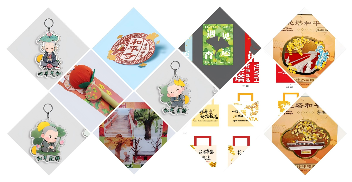 历经两个月打磨,团队研发出冰箱贴、钥匙扣、手提袋等14类兼顾传统韵味与现代实用性的文创产品,经筛选,6类代表性产品完成实物转化,成为传播花塔村文脉的“流动载体”。