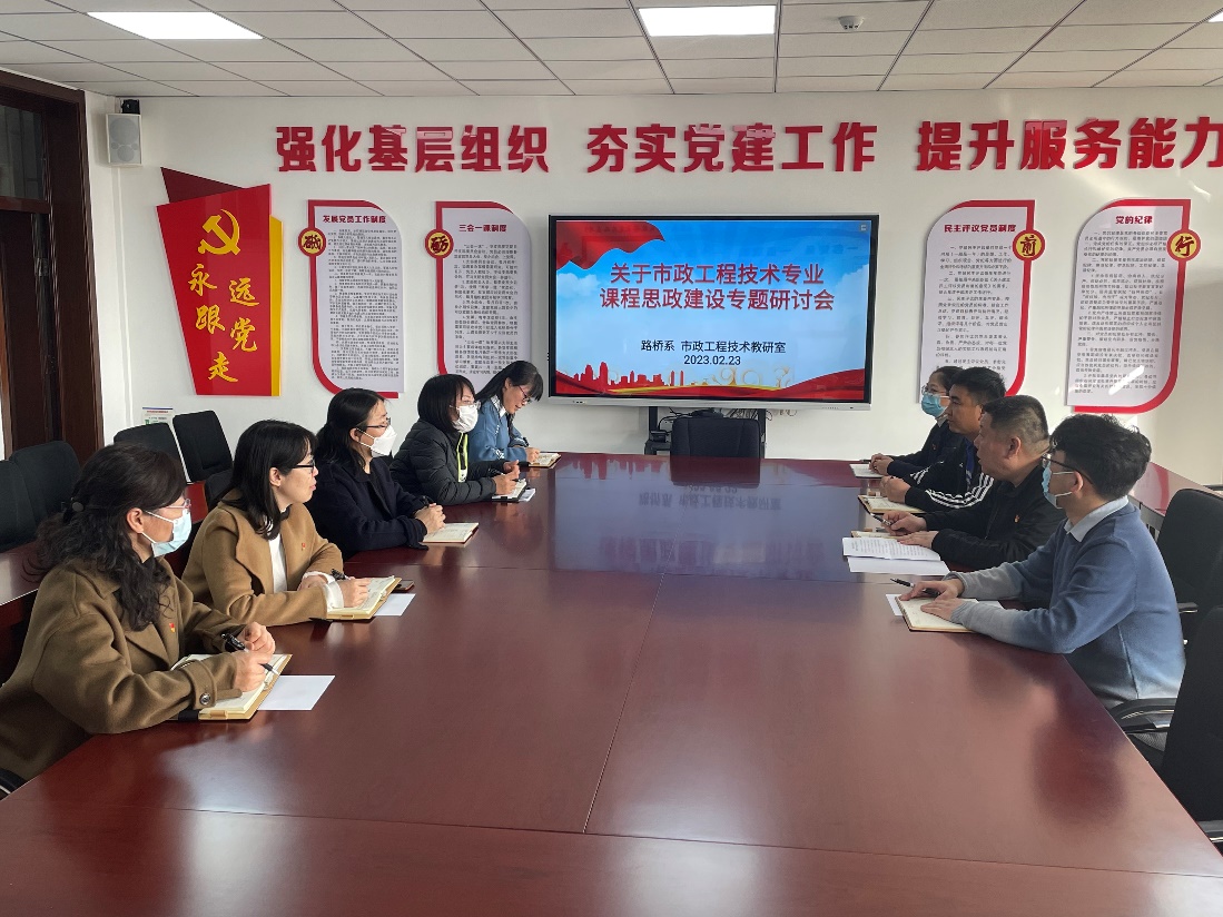 高校落实“立德树人”根本任务,“课程思政”建设至关重要。223日下午,路桥系在五楼会议室,举办“市政工程技术专业课程思政建设”专题研讨会,路桥系党支部书记、班主任及全体专业教师参加会议。