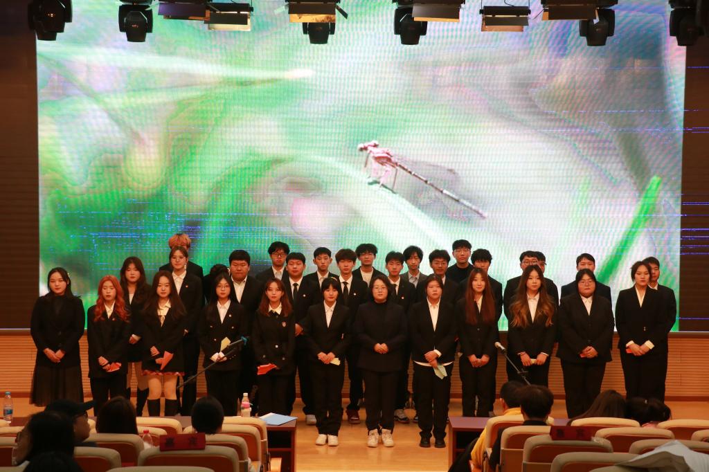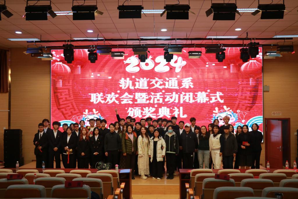 在轨道交通系党支部书记黄亚楠老师的新年总结讲话中,轨道交通系2024年联欢会暨活动闭幕式颁奖典礼落下帷幕,最后学院领导老师,演职人员和工作人员上台合影留念。