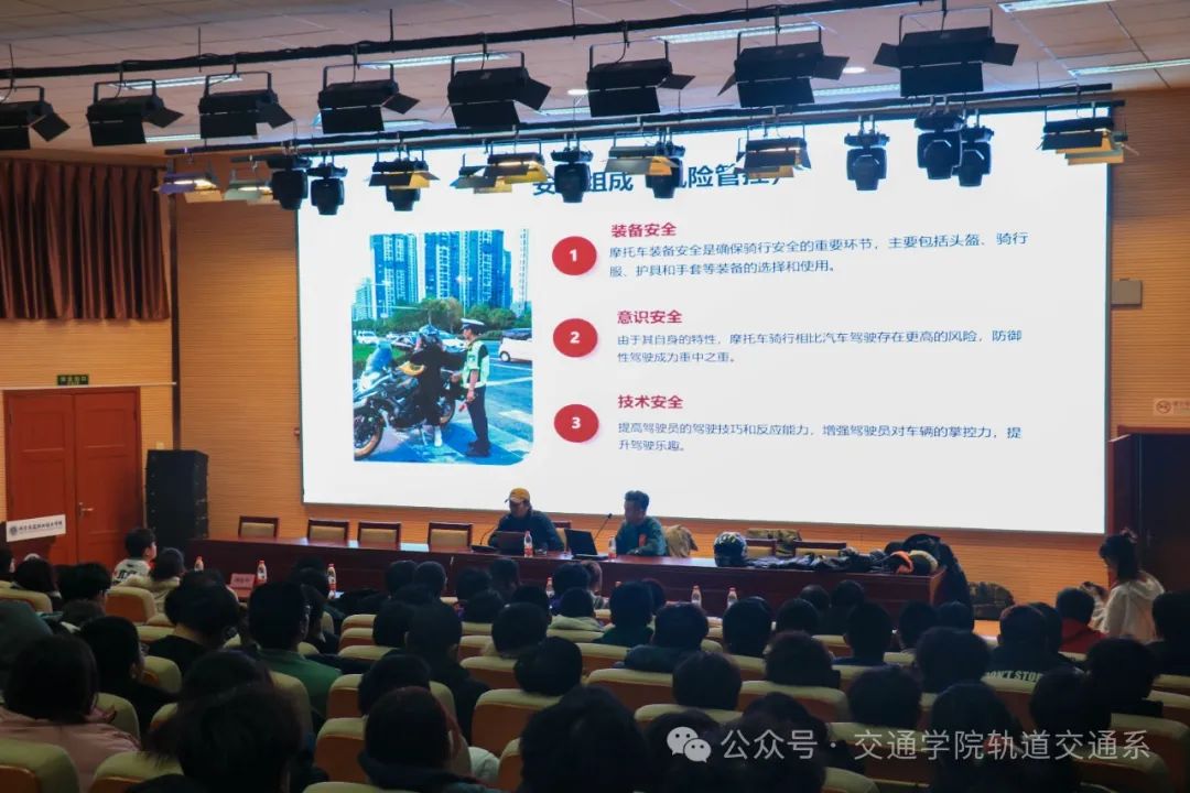 为进一步强化学生交通安全意识,切实提升学生的自我保护能力,轨道交通系于2024 年 11 月 28 日 14:00,在报告厅举行了“摩托车安全驾驶”交通安全讲座。北京石碳纪梁杨老师、门红昌老师、郝振华老师、轨道交通系全体班主任出席会议。