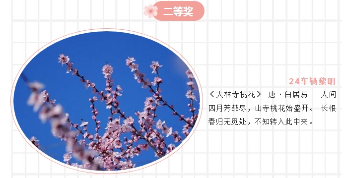 为深入贯彻落实德智体美劳“五育并举”育人理念,激发青年学子传承文化、创新实践的热情,轨道交通系于4月3日至14日成功举办“春日诗韵映繁花”春日花卉摄影与诗句融合大赛。活动以“撷春日繁花光影,品千年诗意芳华”为主题,通过镜头与诗句的碰撞,展现当代青年的文化自信与艺术创造力。