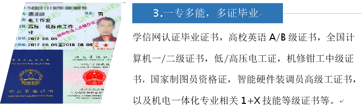 学信网认证毕业证书,高校英语A/B级证书,全国计算机一/二级证书,低/高压电工证,机修钳工中级证书,国家制图员资格证,智能硬件装调员高级工证书,以及机电一体化专业相关1+X技能等级证书等。