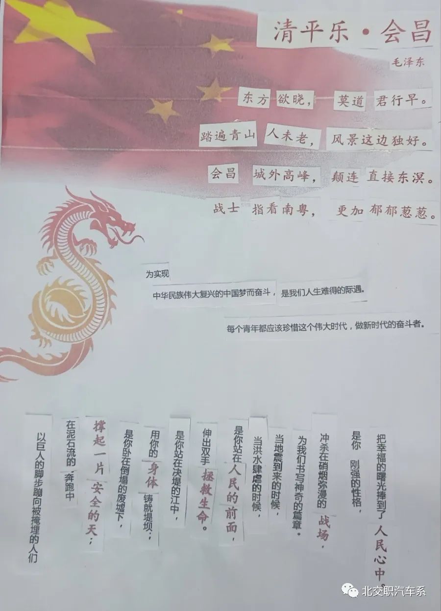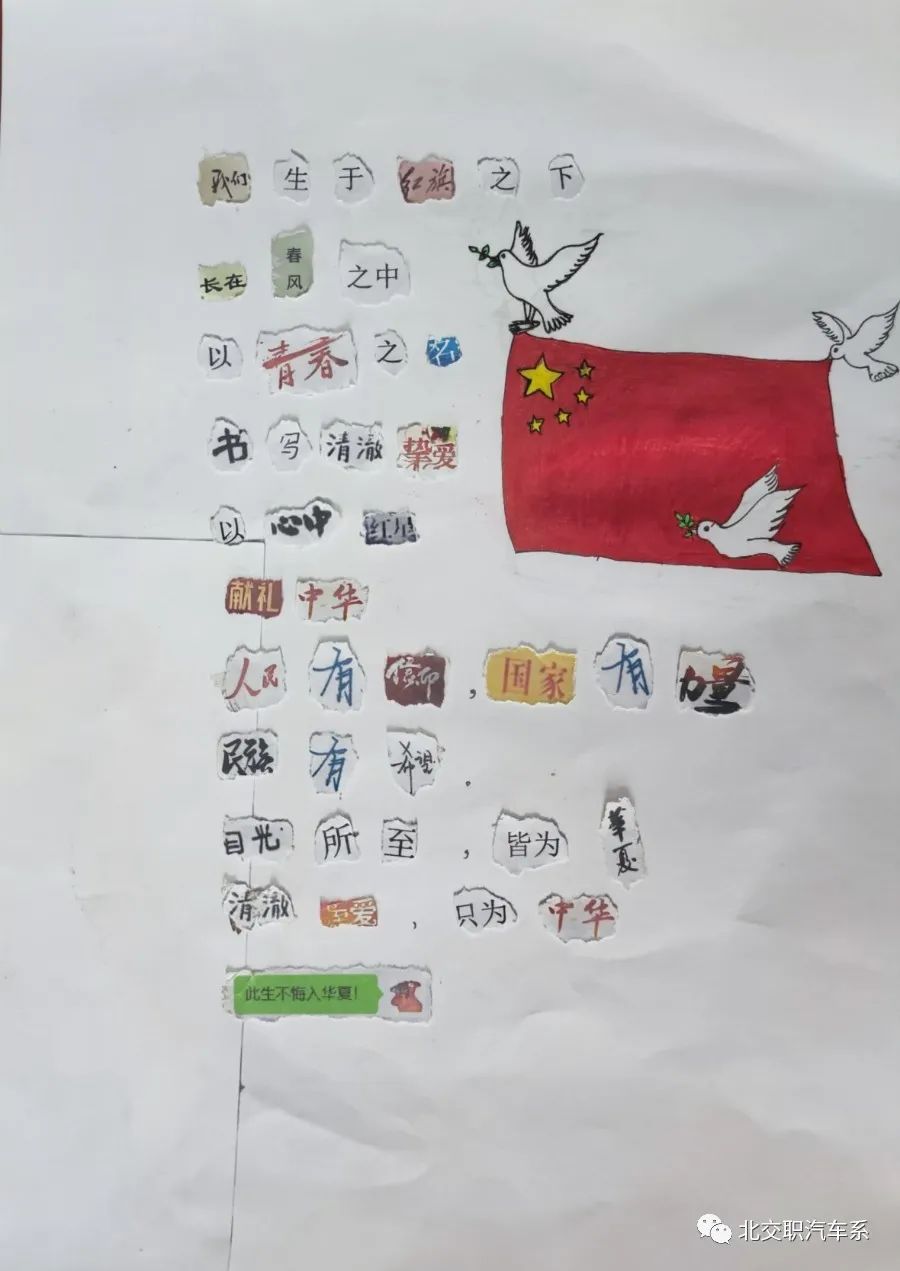 在百年未有之变局的新时期,我们仍离不开对民族文化精神的学习与传承。通过此次“五四”主题拼贴诗活动,同学们意识到在美好的青春里,要做新时代的读书人、奋斗者,腹有书香气自华,志存高远,脚踏实地,拼搏奋进。