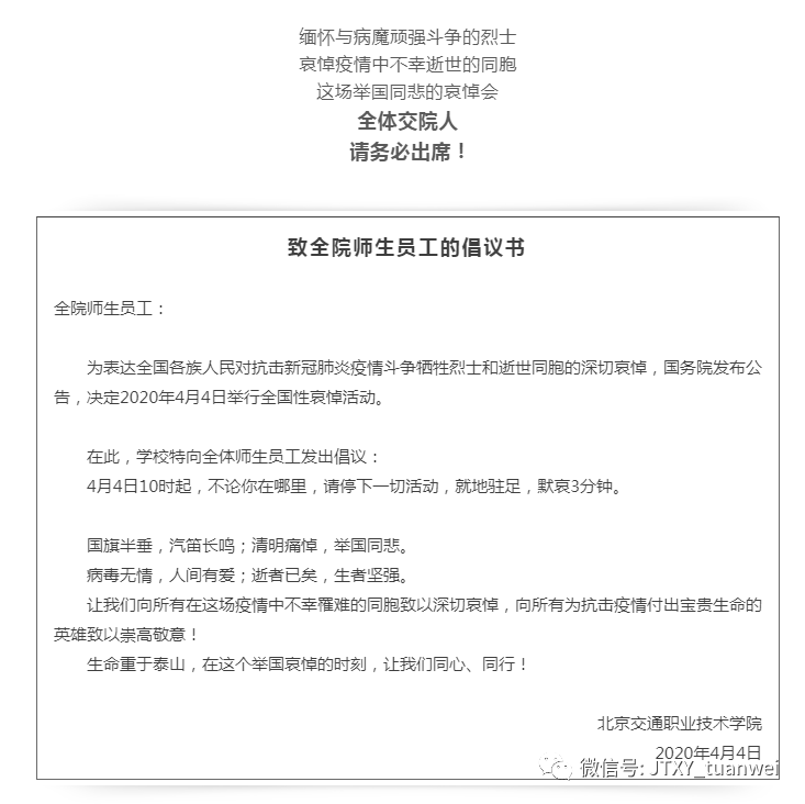 按照国务院办公厅《关于为新冠肺炎疫情牺牲烈士和逝世同胞举行全国性哀悼活动的通知》要求,2020年4月4日,我院全体团员青年在院团委的安排下,于当日10:00停止一切娱乐活动,默哀三分钟,伴随着汽车、火车、舰船的鸣笛声和防空警报的鸣响,深切缅怀我们的抗疫英雄,遥寄一份对逝去英烈和同胞的哀思。