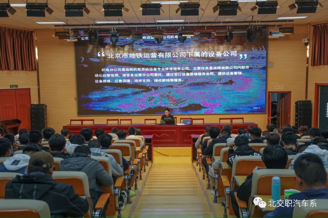北京地铁机电分公司企业高管田靖源老师面向城市轨道交通机电技术、机电一体化技术两个专业(合称机电专业)的全体同学开展了机电企业的福利待遇和职业发展的宣讲会。通过实例分析和案例分享,田老师与机电专业的同学们一起讨论对专业的认识,并激发了新生对本专业的热情,让同学们对地铁企业的运营模式、技术创新和市场竞争有了更深入的了解。最后,田老师介绍了地铁企业对人才的需求情况,对人才培养的重视,以及紧密贴合的职工的职业规划,力图为即将步入职场的同学们提供了一个广阔的择业空间和职业发展道路。