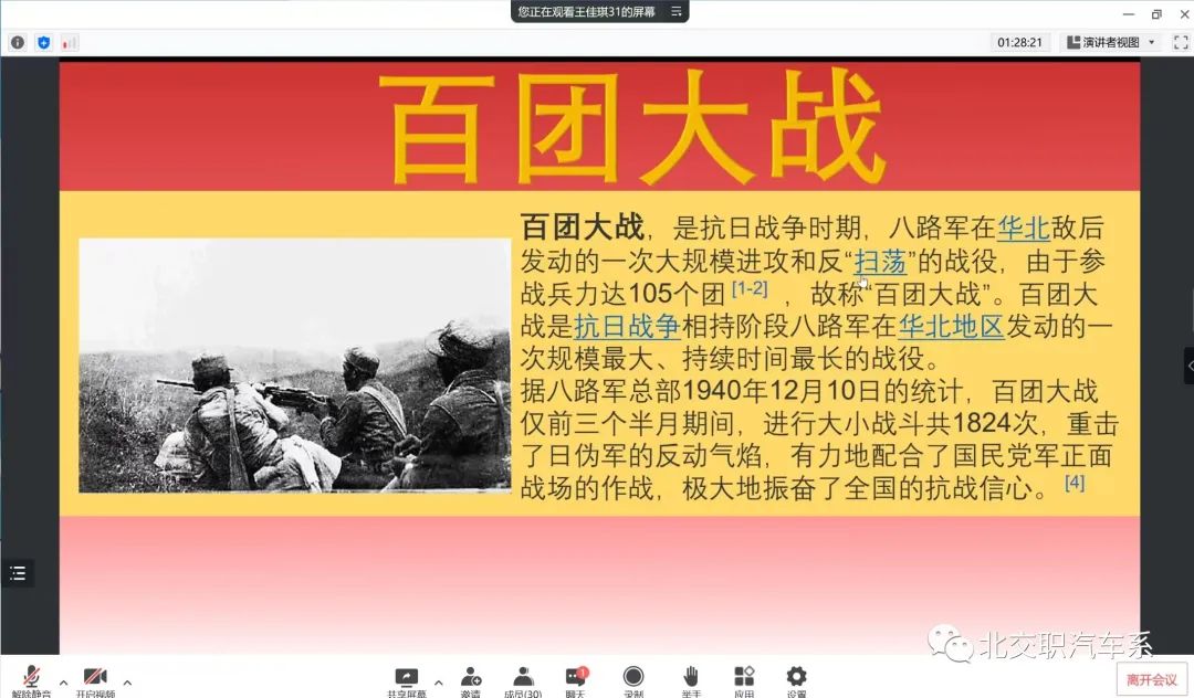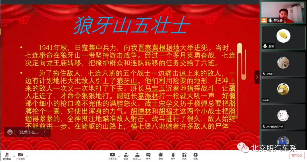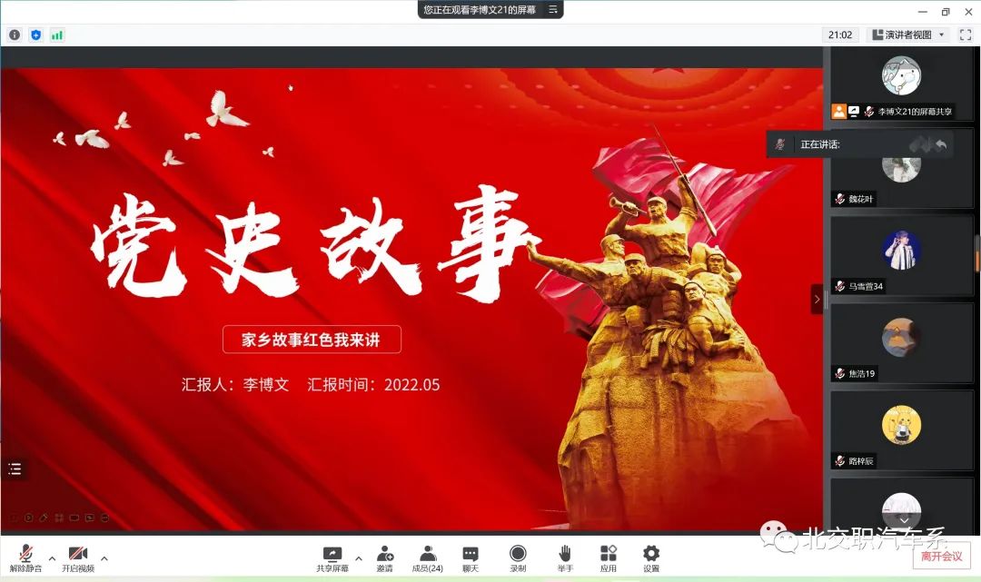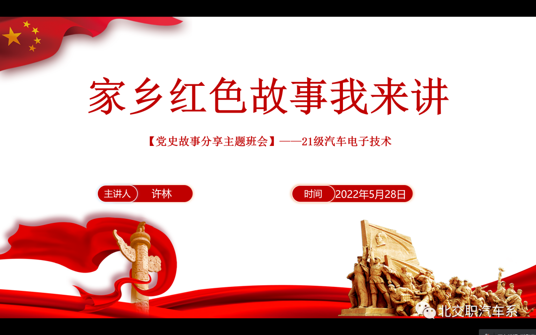 为增强学生爱党爱国情感,深入推进党史学习教育,缅怀革命先烈,回顾党的光辉历程,厚植爱国爱党情怀,bevictor伟德官网汽车系各班分别举办的“家乡红色故事我来讲”宣讲活动,汽车系各班同学都积极参与。此次红色宣讲活动重点围绕家乡红色故事,讲述中国共产党人和红色革命事迹。同学们将红色事迹与缅怀革命先烈、传承红色基因紧密结合,慷慨激昂地讲述了一个又一个感人至深的红色故事,同学们声情并茂,采取幻灯片、视频相结合的方式,对家乡红色故事进行生动的宣讲,带领大家重温革命年代共产党人的峥嵘岁月。