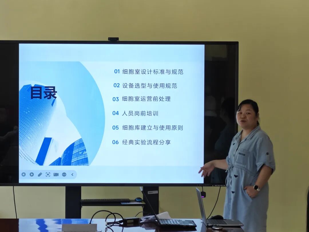 会上,公司代表李杏典详解公司服务及细胞间实验室建设细节。她提到,公司可通过共建课程、合作建实训基地、开展细胞实训培训、供应实训耗材等,提供全方位支持;实验室建设方面,可提供从规划设计、设备选型到安装调试的一站式服务,保障教学科研需求与操作规范安全。