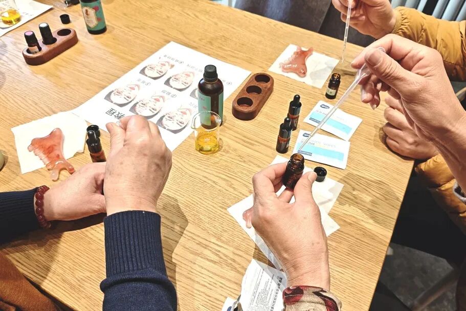 学院管理系化妆品经营与管理专业高润副教授为居民们详细讲解了精油的种类、功效、用途及精油制作的基本步骤和注意事项,并指导大家亲手制作专属护肤精油。居民们兴致勃勃地挑选基础油和香薰精油,按照个人喜好调配出独一无二的配方。活动现场,气氛热烈,居民们热情参与,纷纷动手制作适合自己的专属护肤精油。