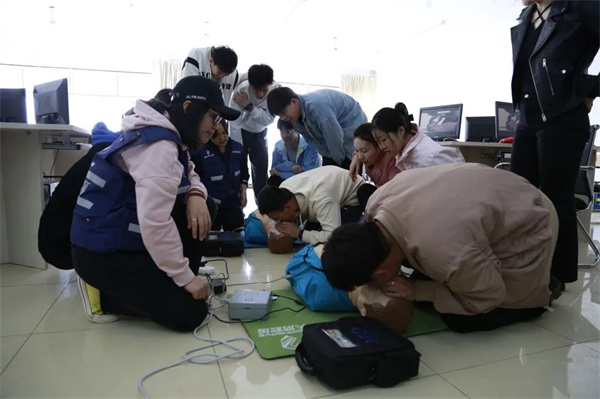本次培训共计3小时,内容主要包括心肺复苏(CPR)、自动体外除颤器(AED)使用及各种包扎方法训练,采用理论和实践相结合的方式,导师先讲解操作方法及要点,学生和老师分组练习。培训现场配备三套具有反馈功能的模拟人和训练用AED;每人一个急救包,内含:酒精消毒棉片2片、一次性口罩1只、纱布辅料1包、绷带1卷、一次性CPR呼吸面膜1片、一次性单向阀1只,三角巾一块。师生均有练习机会,实操过程中有专门的导师对动作进行指导,保证了培训效果,让师生真正掌握救命技能。
