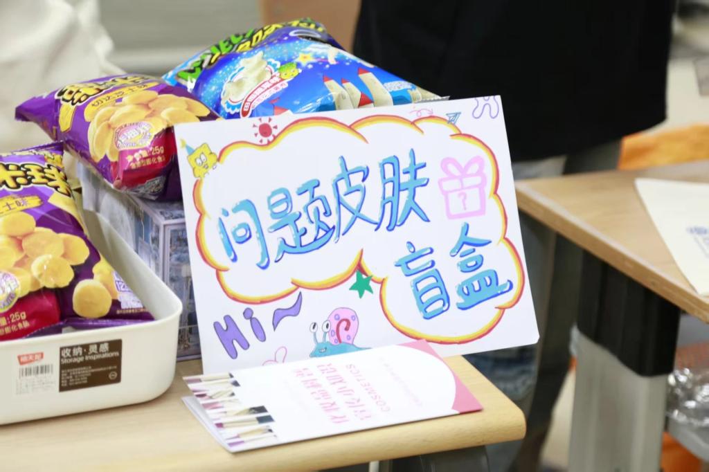护肤知识互动区充满欢声笑语。“护肤顺序排排看”游戏中,参与者将写有洁面、精华液等护肤步骤的卡片重新排序,成功完成的同学不仅收获了化妆包、护手霜等小奖品,还从工作人员的讲解中深入了解到每个步骤的作用。“皮肤问题盲盒”同样人气十足,大家抽取写有痤疮、色斑等问题的纸条后,通过匹配解决方法卡片学习护肤知识,工作人员还会补充讲解问题成因与全面解决方案,让参与者在游戏中轻松掌握护肤技巧。