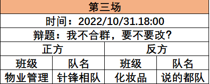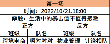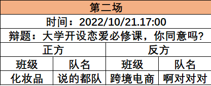 本次比赛公平、公正、公开,参赛人员分别为22级化妆品经营与管理、22级现代物业管理与22级跨境电子商务三个专业,每队分为正、反两方分别有四个辩手,对战情况如下: