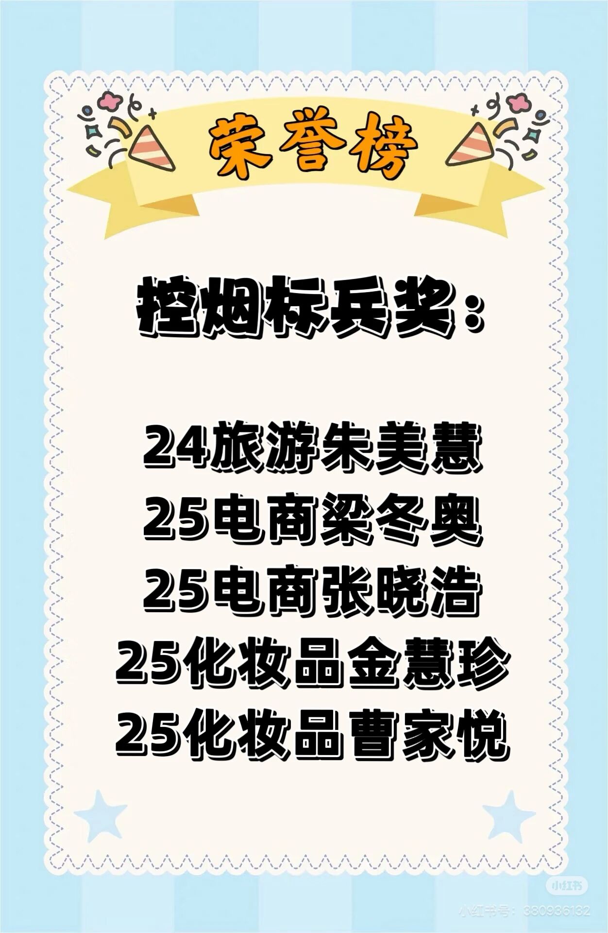 此次控烟标兵评选,进一步强化了健康理念与文明素养,有效提升了校园控烟成效。并将持续开展无烟校园建设,完善监督机制,丰富宣传形式,以典型引路、以示范带动,让控烟成为自觉,让文明成为习惯,共同打造安全、健康、文明的美好校园。