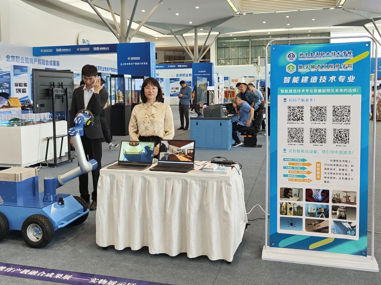 会议同期举办了北京职业教育产教融合成果展,集中展示北京118个校企共建“工程师学院和技术技能大师工作室”成果,我院数字城市工程师学院和无人机智能制造与应用工程师学院受邀参展,教务处处长冯卡带领路桥系专职教师周二峰、赵久敏、贾方方、林永清及轨道交通系书记徐国栋进行现场讲解。