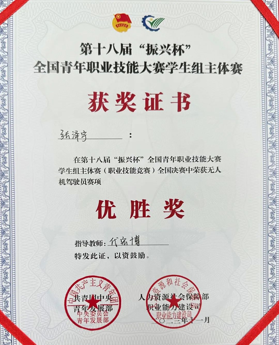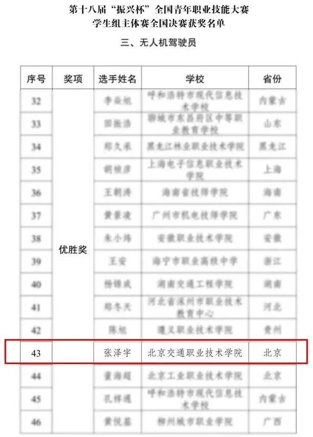 本次大赛以“踔厉奋发启新程 挺膺担当建新功”为主题,主体赛于11月25日至28日在杭州举办,聚焦新职业、新领域,设置智能硬件装调员、工业视觉系统运维员S、无人机驾驶员、仪器仪表维修工、机床装调维修工5个竞赛职业(工种),大赛吸引超过12万名学生参加,经过层层选拔,最终436名选手同台竞技,经过激烈角逐,我院无人机应用专业学生张泽宇在无人机驾驶员赛项荣获优胜奖,在北京代表队中排名第二。