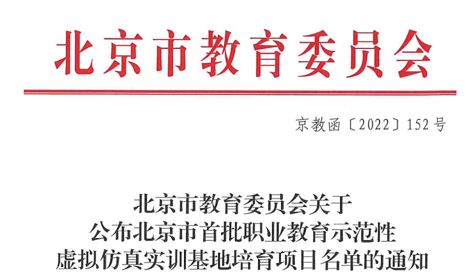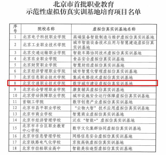 2022年4月25日,北京市教育委员会公布了北京市首批职业教育示范性虚拟仿真实训基地培育项目名单,bevictor伟德官网“数字城市建设虚拟仿真实训基地”名列其中。